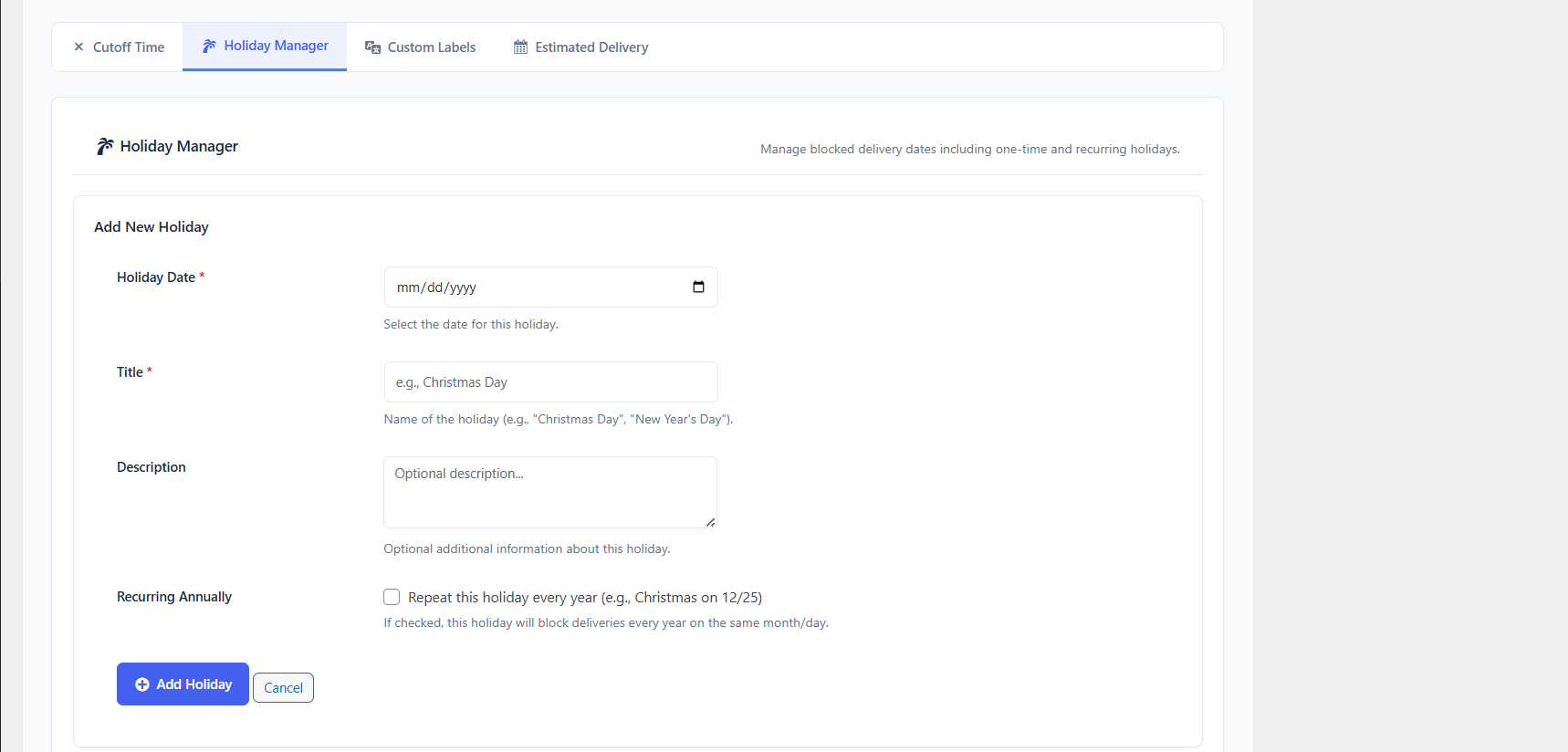 Delivery slot controls per product / zone Holiday and blackout handling Checkout validation + clear errors